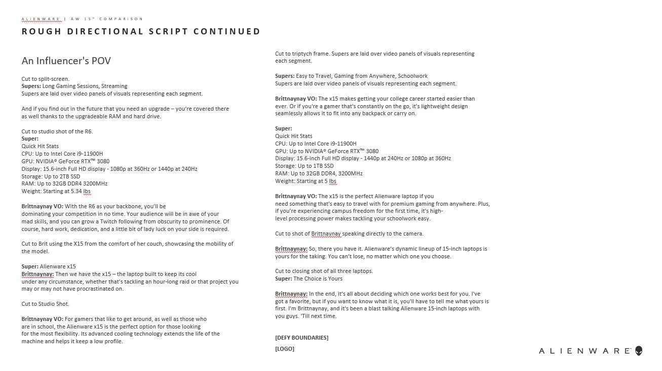 Proved that one voice, when trusted, can deliver a full product story effectivelyAlienware 15-inch Laptop Comparison Video with Brittnaynay