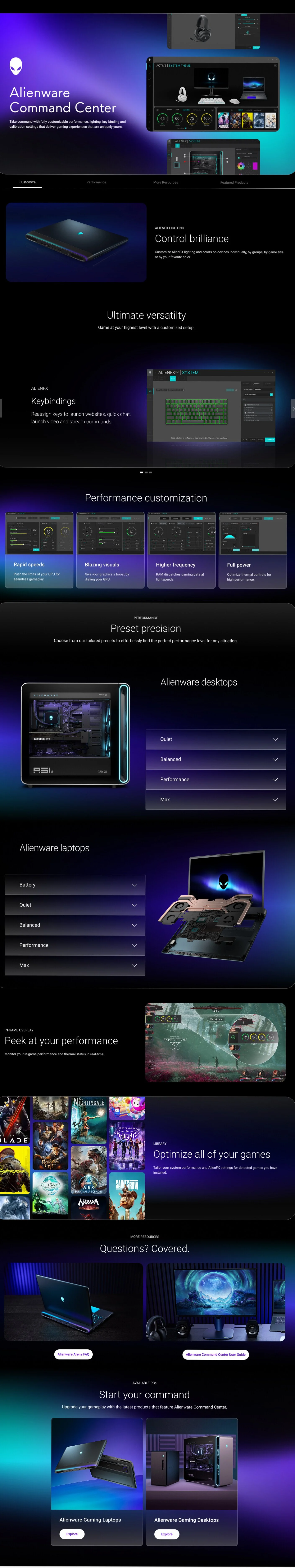 As part of the rollout for Alienware’s next-generation hardware (AW30) and the Pro Series keyboard/mouse/headset ecosystem, we were tasked with revamping the Alienware Command Center (AWCC) landing page—a high-traffic, multi-functional page that showcases Alienware’s custom performance software.